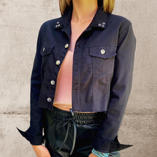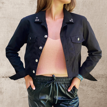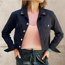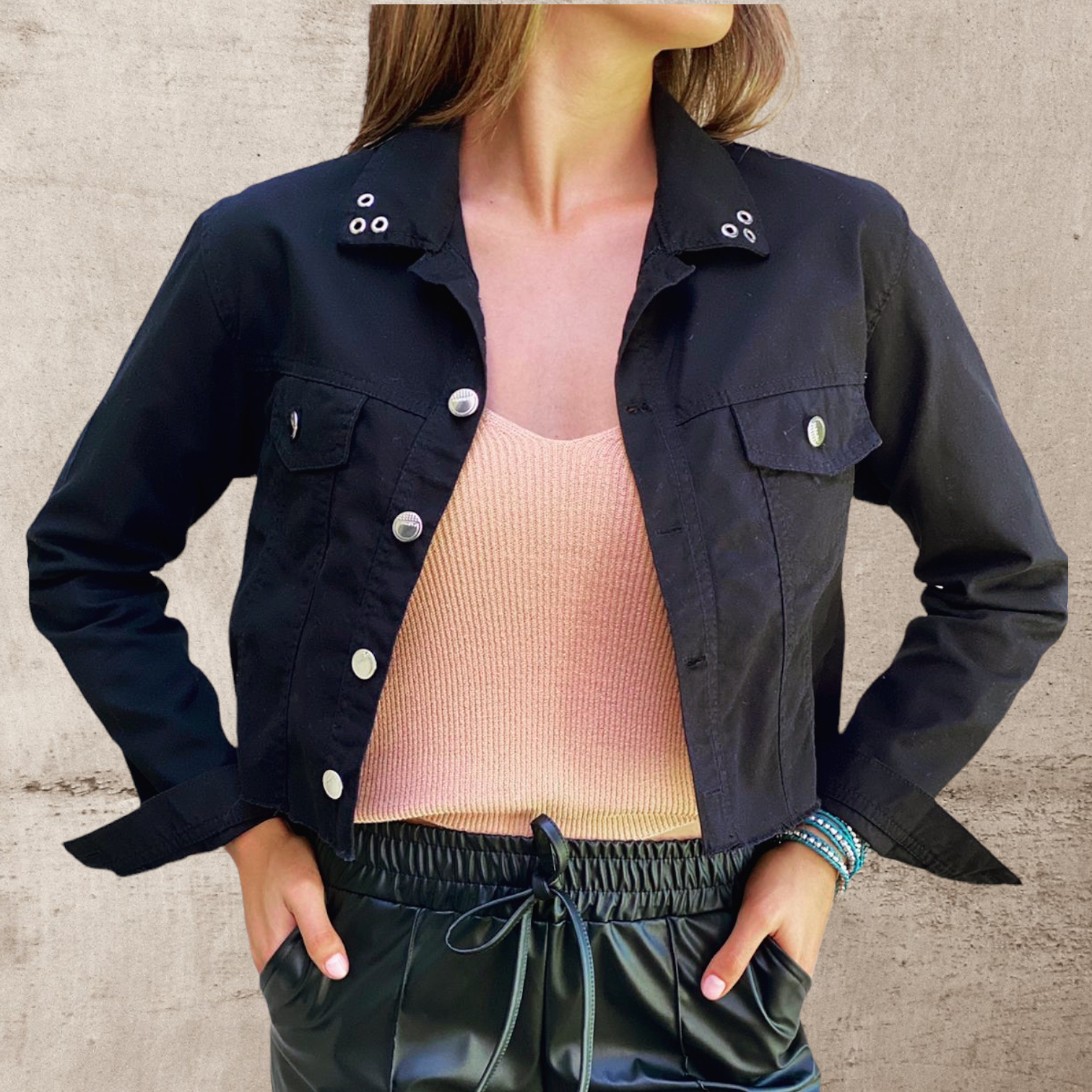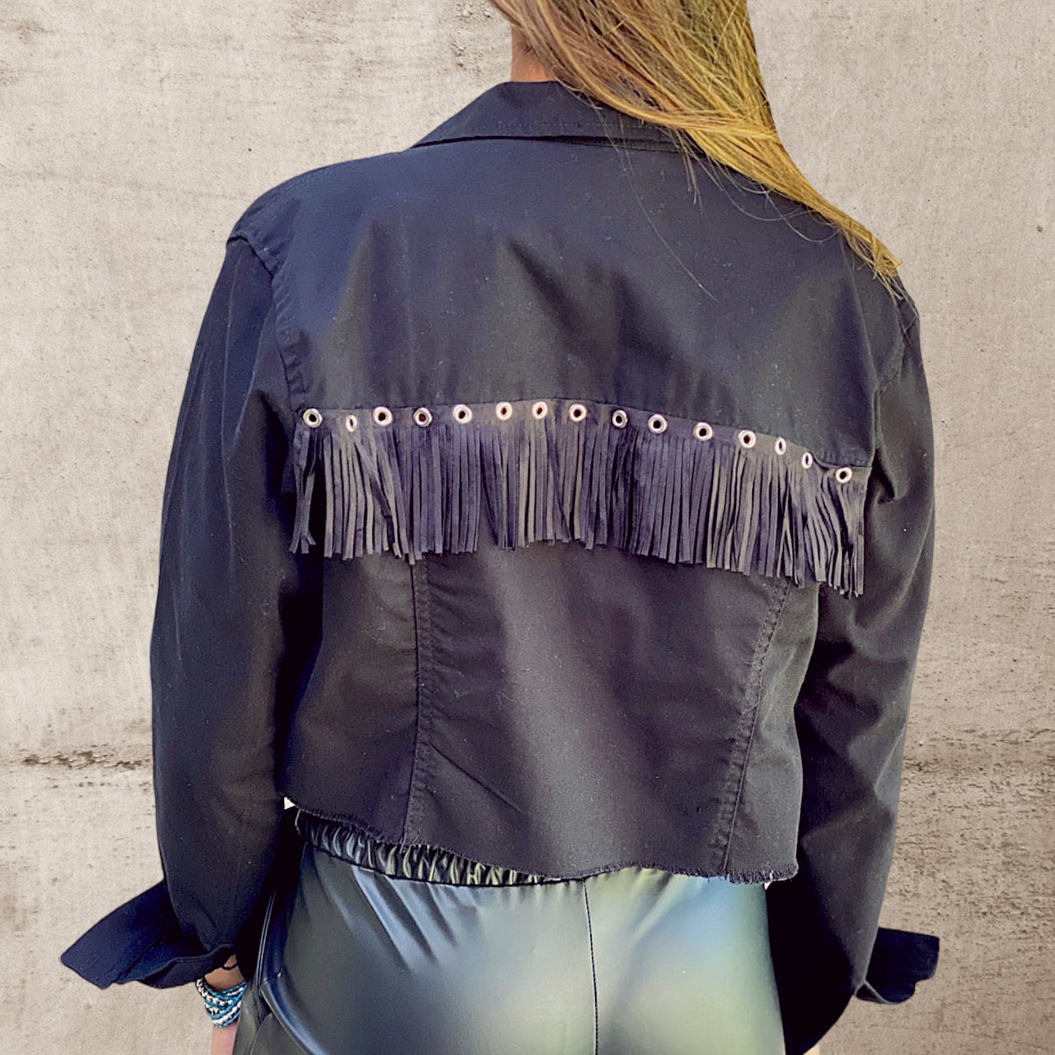 Campera negra de jean con detalles de tachas y flecos en la espalda