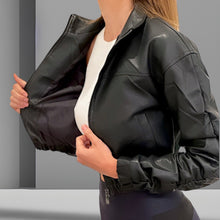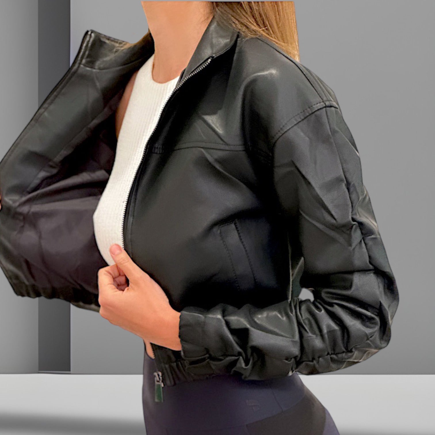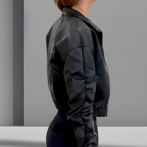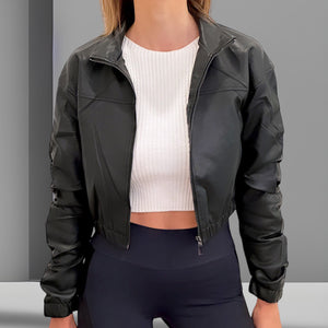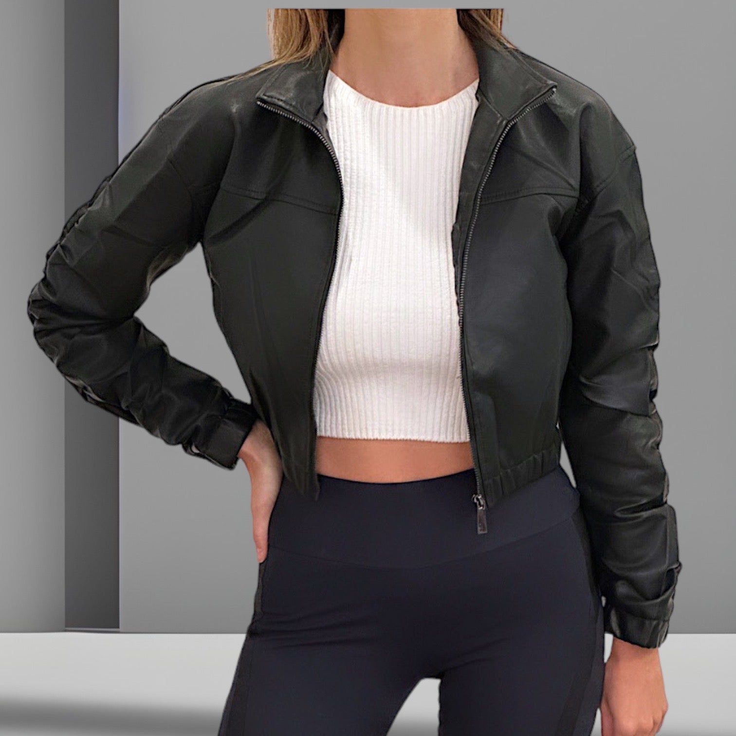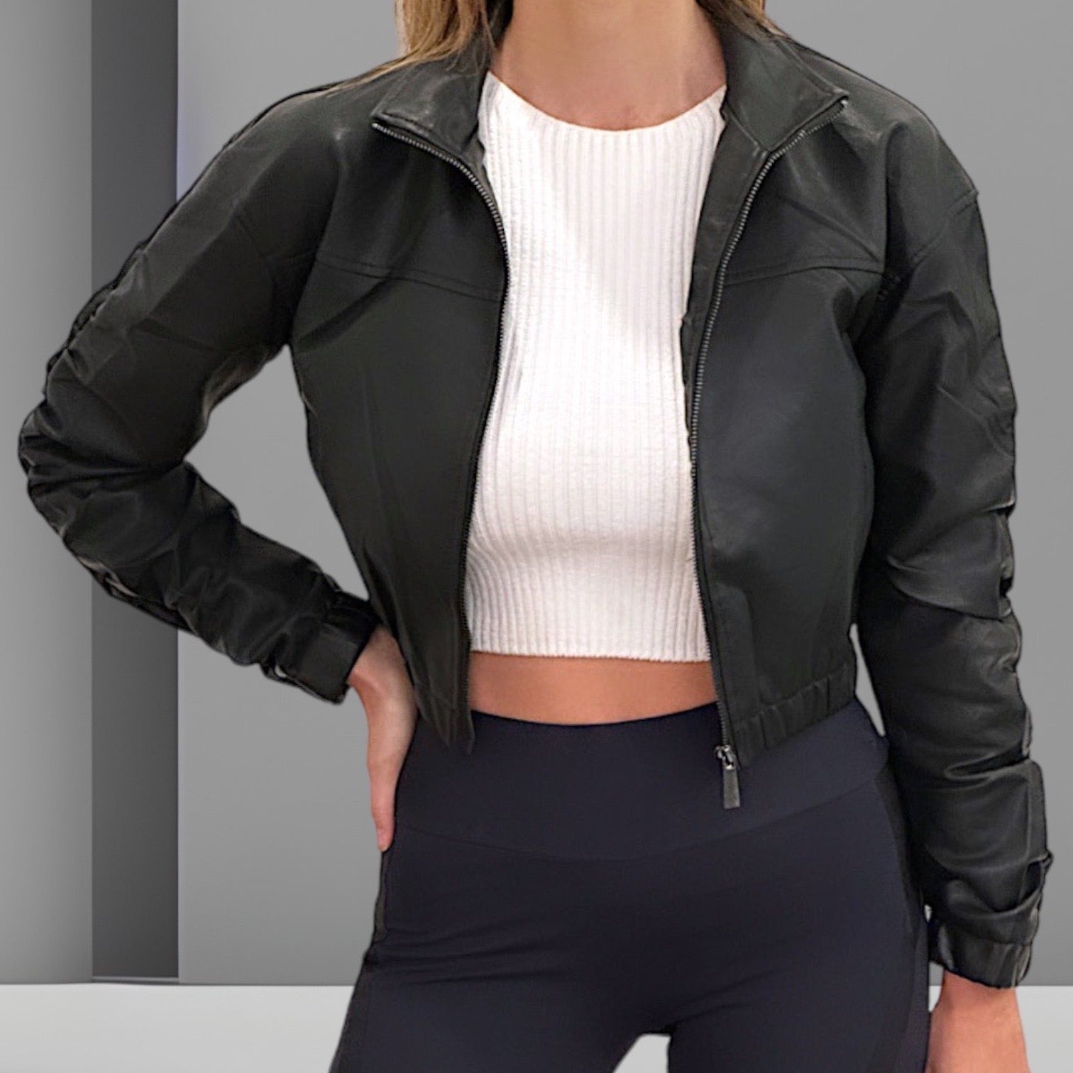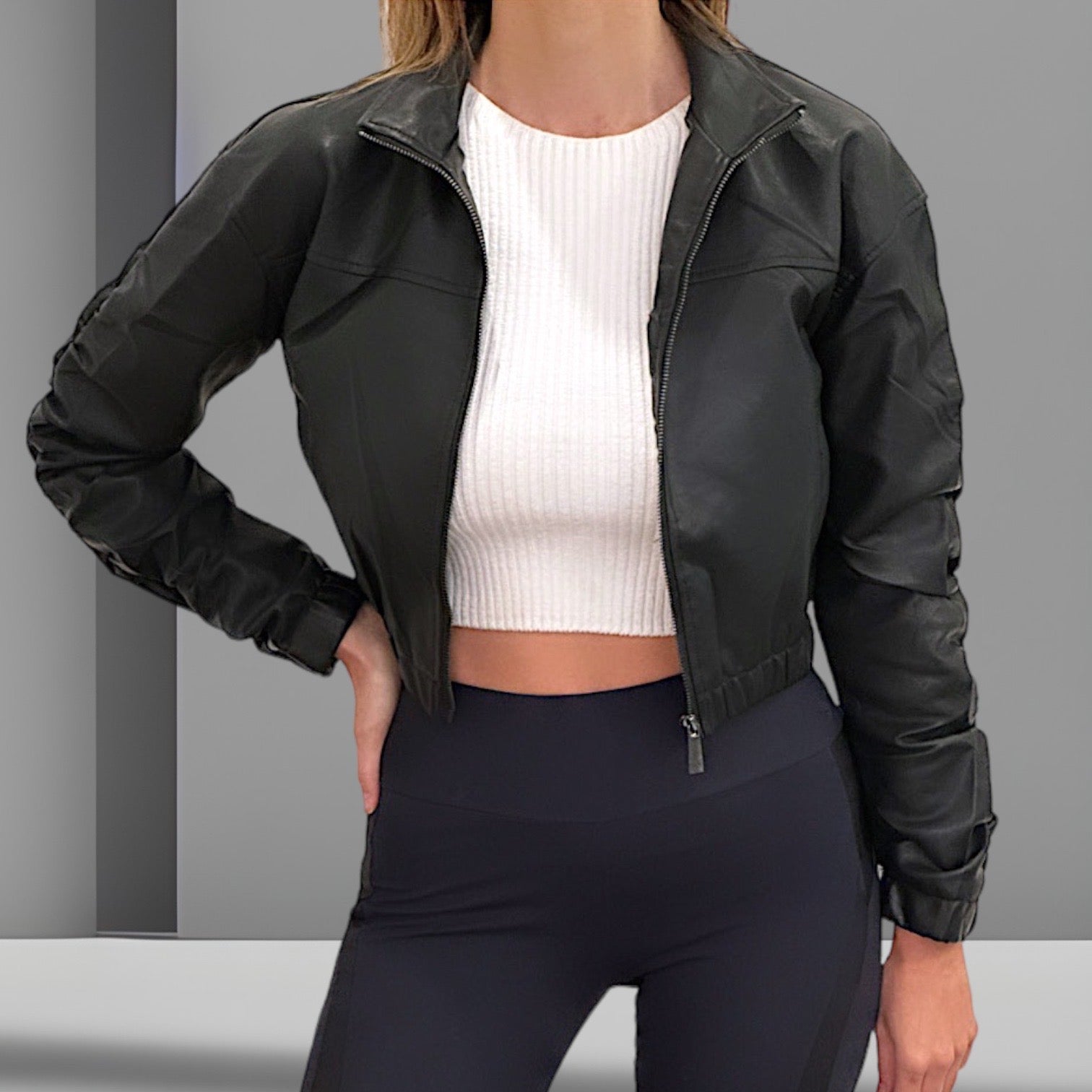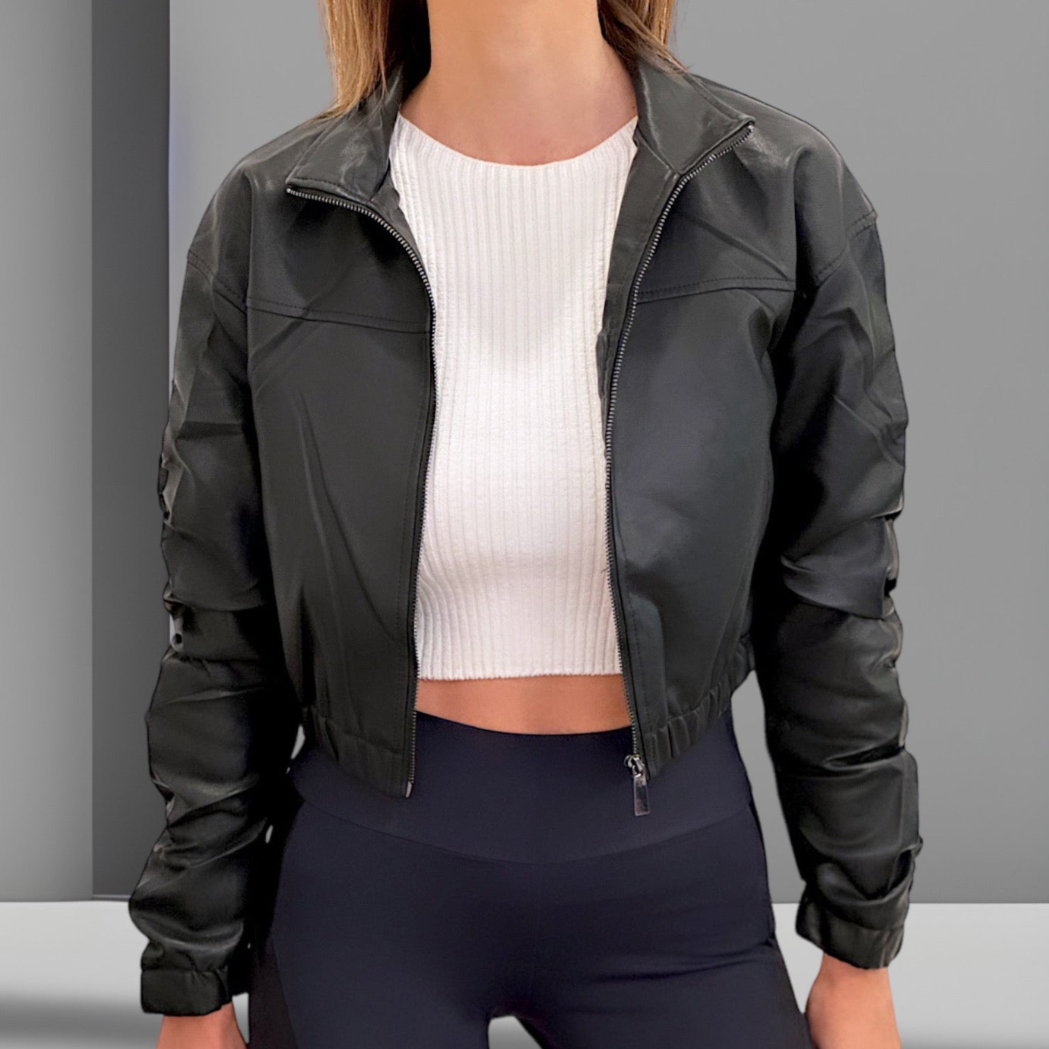 Campera negra en simil cuero con detalle fruncido en las mangas y engomado en puños y cintura