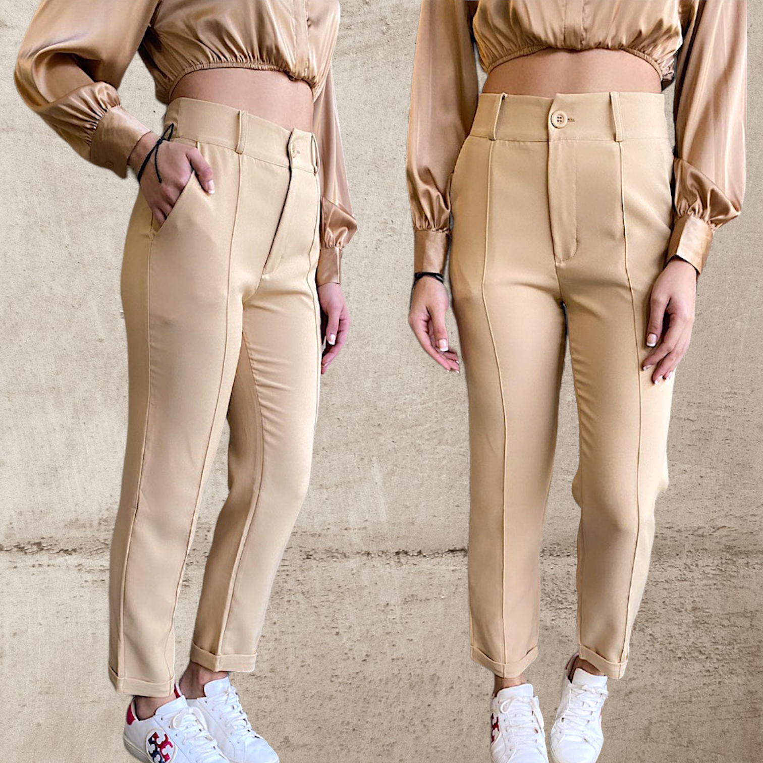 Pantalón beige de vestir con bolsillos a los costados, sin bolsillos en la parte de atrás. Muy buena caída, de poliéster y elastano.